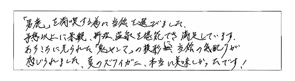 スタッフさま・温泉・食事どれも良かったです。とてもきもち良く過ごすことができました。