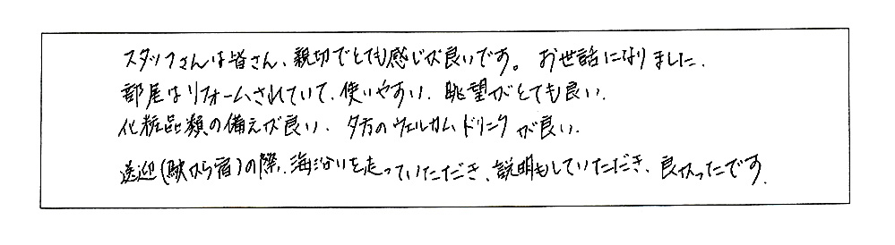 親切なご対応と優しいお声がけいただき快適にすごせました。