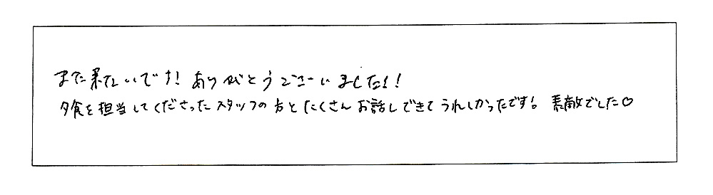 ご飯がすっごくおいしかったです。スタッフさんみなさん、ありがとうございます。