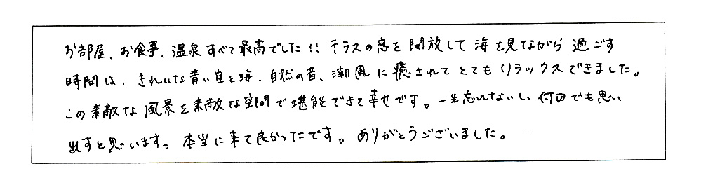 部屋、食事場所、お風呂すべてから海が見えて素晴しかった。
